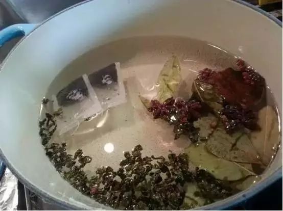原锅倒掉水,洗净,放香叶、桂皮、花椒、八角、陈皮,茶叶、适量盐倒清水(约3公斤),中火烧15分钟。