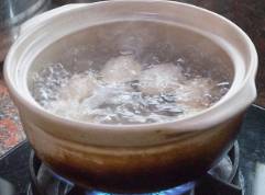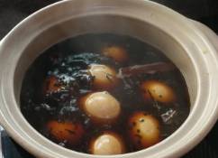 2、鸡蛋放入沙锅内,加入香料包、绍酒,酱油及适量开水,用旺火煮约1小时,蛋壳呈茶褐色时即可食用。