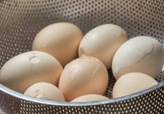 捞出鸡蛋,装盛有冷水的盆中,让鸡蛋冷却,边让鸡蛋冷却边用勺子敲打鸡蛋壳,均匀敲碎方便鸡蛋进盐入味。
