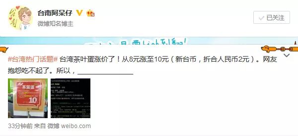 知名博主@台南阿呆仔 微博称:“台湾茶叶蛋涨价了!从8月涨至10元(新台币,折合人民币2元)。网友抱怨吃不起了。”