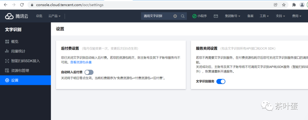首先在腾讯云注册账号,开通通用文字识别服务,如下图所示:文字识别服务打开。文字识别服务每个月可以免费调用1000次,超过次数后开始收费。如下图所示:自动转入后付费关掉后,超过次数就不会收费了,当然也就无法使用api了。