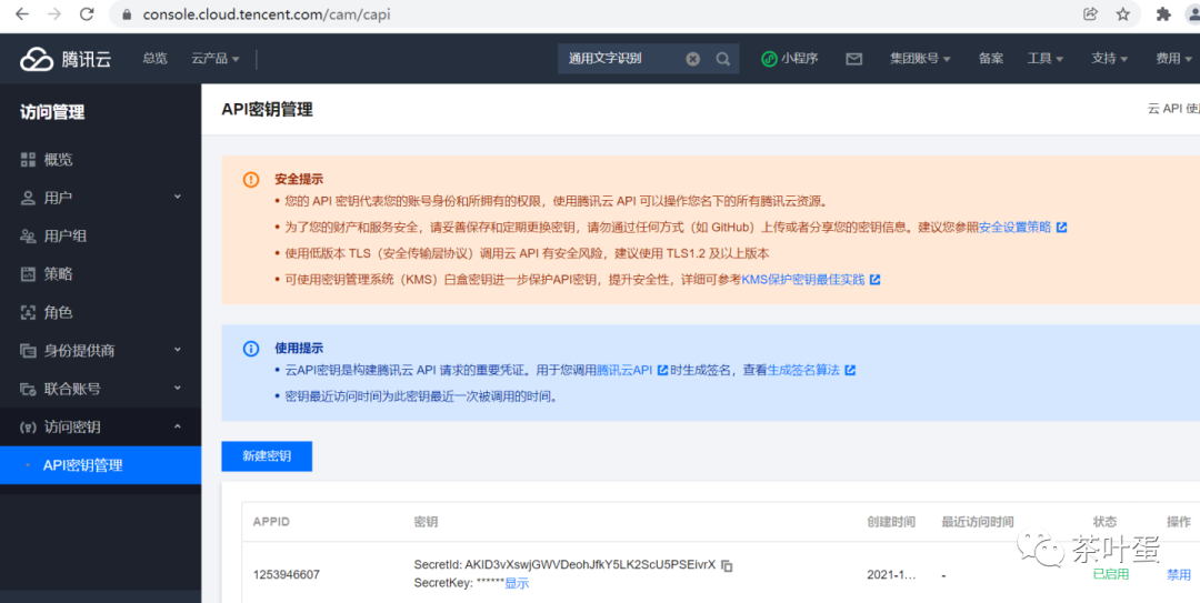 开通服务后,还需要申请访问api的秘钥,申请好以后如下图所示。