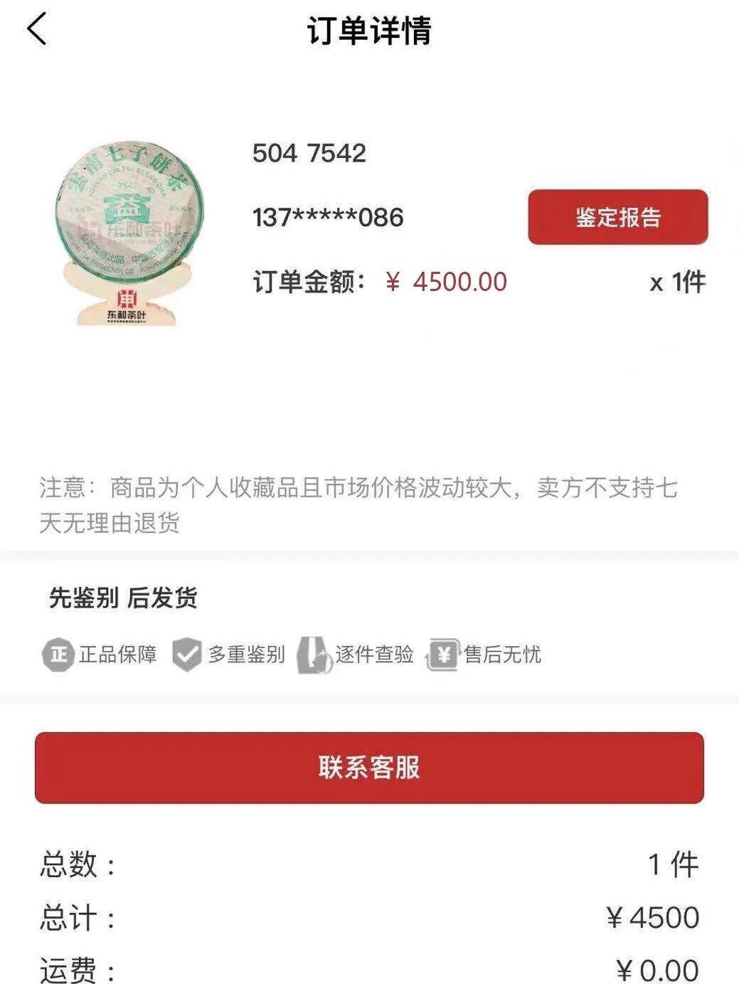 东和平台托管交易有一位来自深圳的客户,用户名称:135*****626,以4500元的价格购买了504 7542 ,规格:一件,并在昨天提货完成交易!此商品在东和茶叶官网参考价60000一件,买家岂不是捡了个大漏?