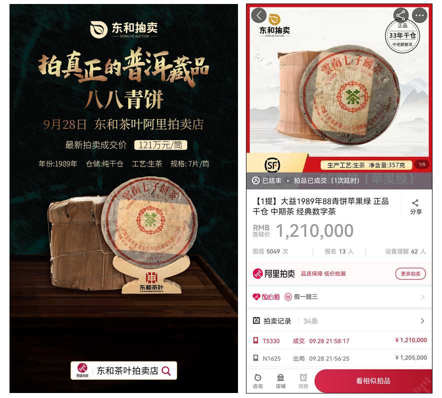 东和拍卖成功拍出八八青饼打破阿里拍卖平台老茶类目藏品成交记录