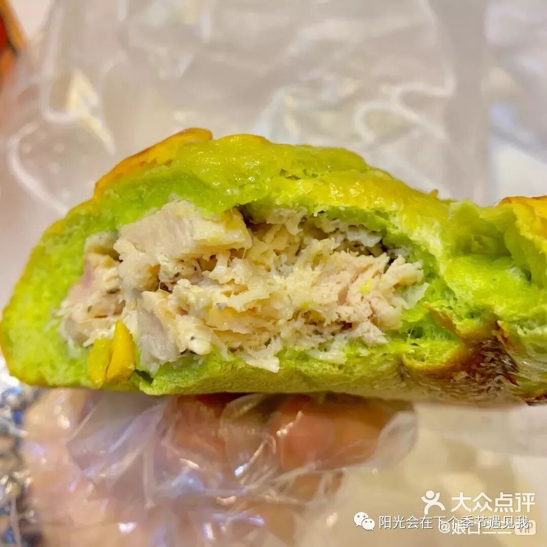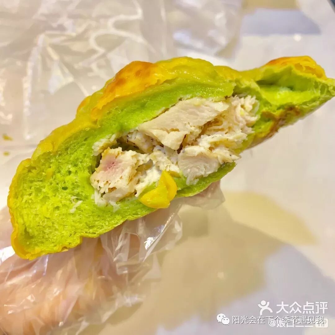 所以能看到里面的鸡肉!鸡肉馅真的!超级!!鲜嫩多汁!!!面包皮上也许裹了一层芝士烤的焦黄焦黄的