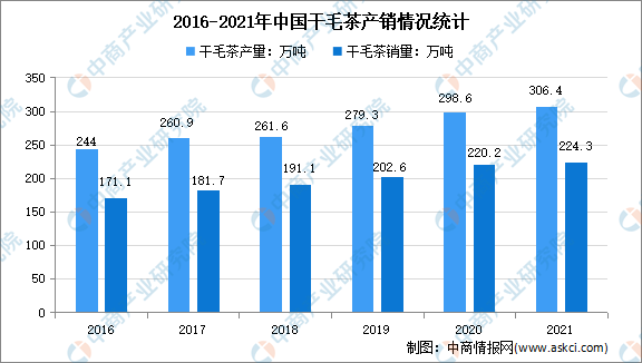 茶叶属于天然健康的饮品,在中国具有悠久的饮茶历史。中国是茶叶最大的生产国,茶叶产量是世界第一。2016年以来,中国茶叶产量呈稳定增长趋势,数据显示,我国茶叶产量从2016年的231.33万吨增长至2020年的297万吨,2020年较上年增加19.28万吨,同比增长6.94%。预计2021年中国干毛茶产量约为306.4万吨,同比增长2.6%;干毛茶销售为224.3万吨,同比增长1.9%。
