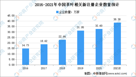 数据显示:2016-2020年中国新注册茶叶相关企业呈逐年增长趋势,中国新注册茶叶相关企业从2016年的14.73万家增长至2020年的32.6万家,同比增长4.99%。2020年,我国新注册茶叶相关企业在业/存续的茶企有31.36万家,比上年增加4.14万家,同比增长15.21%。