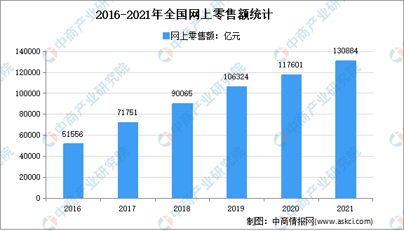近年来,我国电商行业发展十分迅速,交易规模不断扩大。在“互联网+”浪潮推动下,化妆品电商以一种全新的产业业态迅速发展壮大,引爆了网购化妆品的狂潮。数据显示,2021年,全国网上零售额亿元,比上年增长14.1%。其中,实物商品网上零售额亿元,增长12.0%,占社会消费品零售总额的比重为24.5%;在实物商品网上零售额中,吃类、穿类和用类商品分别增长17.8%、8.3%和12.5%。