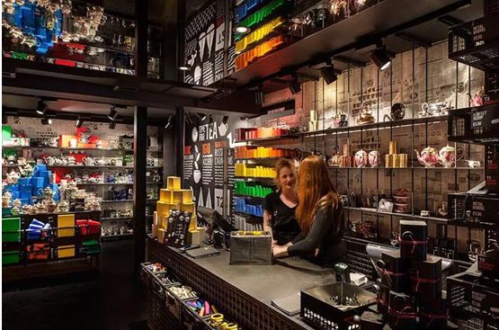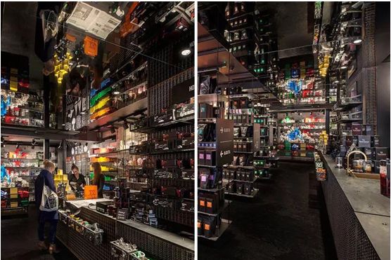 货架、墙面、地面、天花板全是黑色,并将所使用的原材料和框架结构暴露在外,呈现出最本真的状态,与当下创意十足的潮牌店有异曲同工之处。
