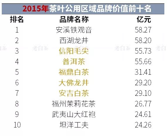 Ⅰ 10年来上榜品牌共有15个,分别为普洱茶、信阳毛尖、福鼎白茶、大佛龙井、安吉白茶、西湖龙井、安溪铁观音、洞庭山碧螺春、祁门红茶、福州茉莉花茶、武夷山大红袍、坦洋工夫、蒙顶山茶、都匀毛尖、六安瓜片。