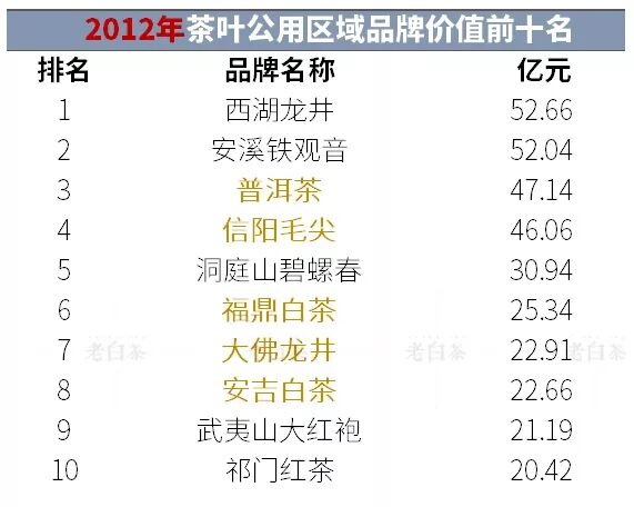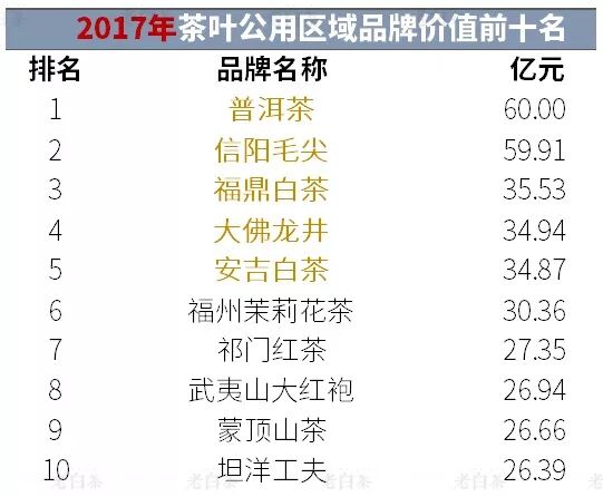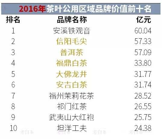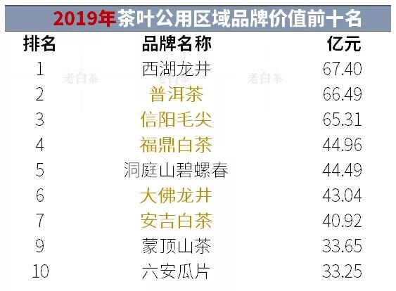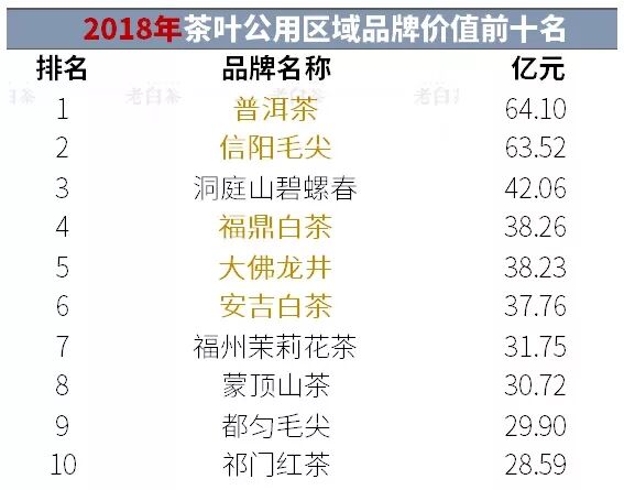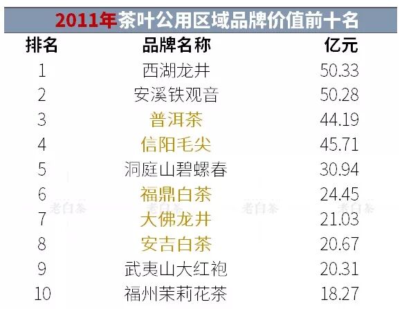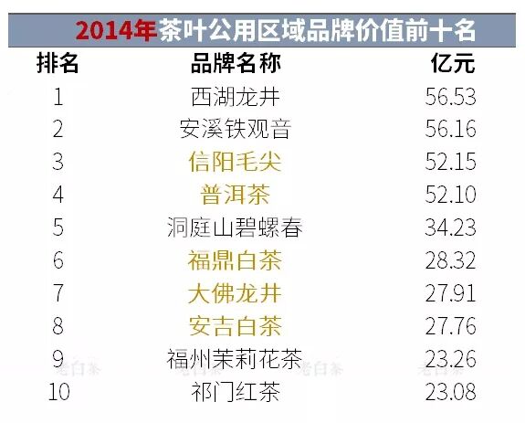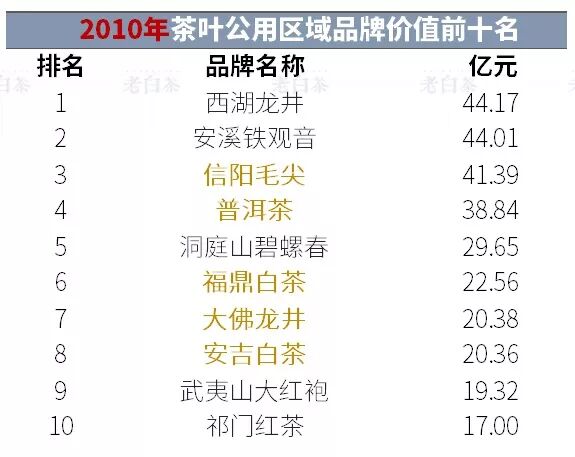 Ⅱ 10年来,普洱茶、信阳毛尖、福鼎白茶、大佛龙井、安吉白茶这5个茶叶公用区域品牌 年年都上榜。