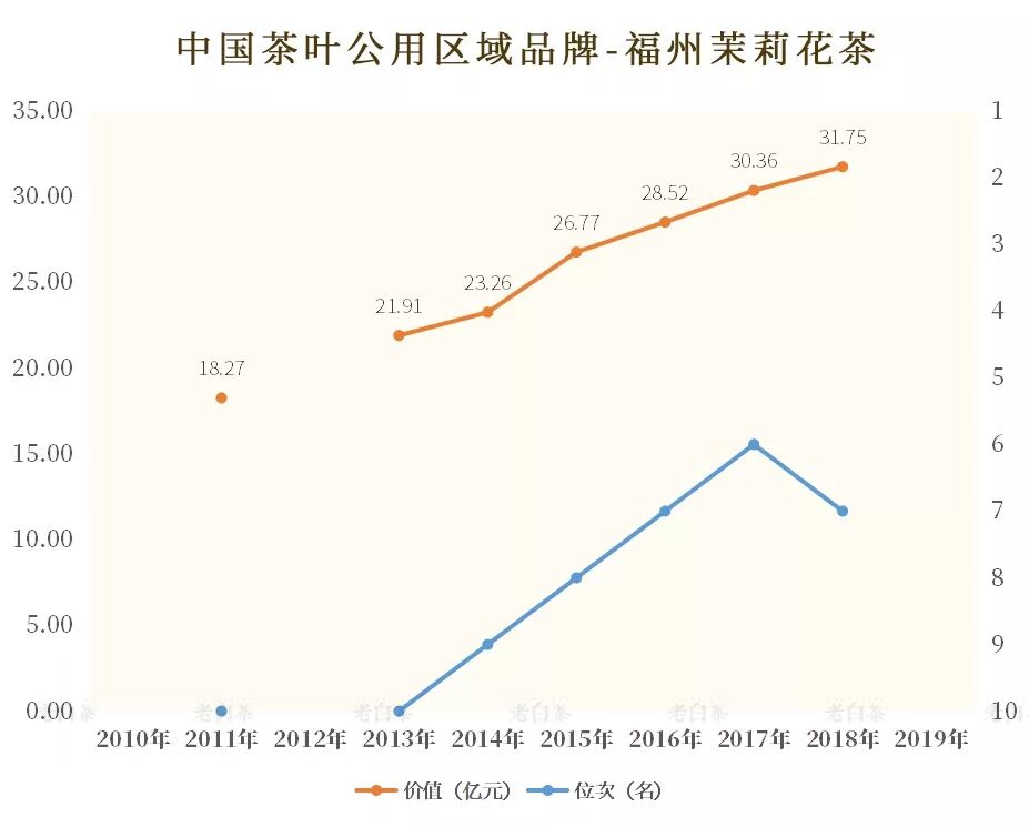 ▲福州茉莉花茶,在10年期间,其排名是有所上升,特别是在2013~2017年连续5年持续增长状态。