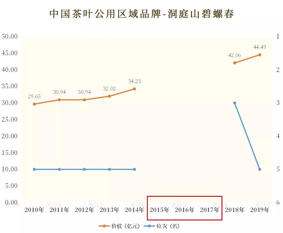 ▲洞庭山碧螺春茶品牌上榜7次,几乎稳定排名第5名,2018年荣登第三名。