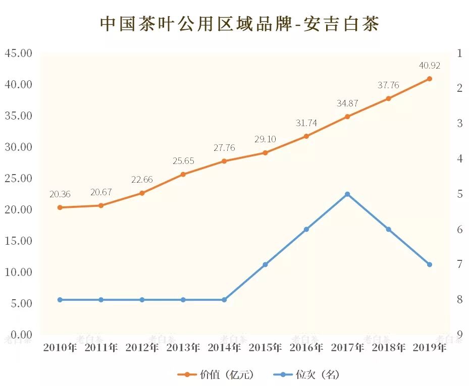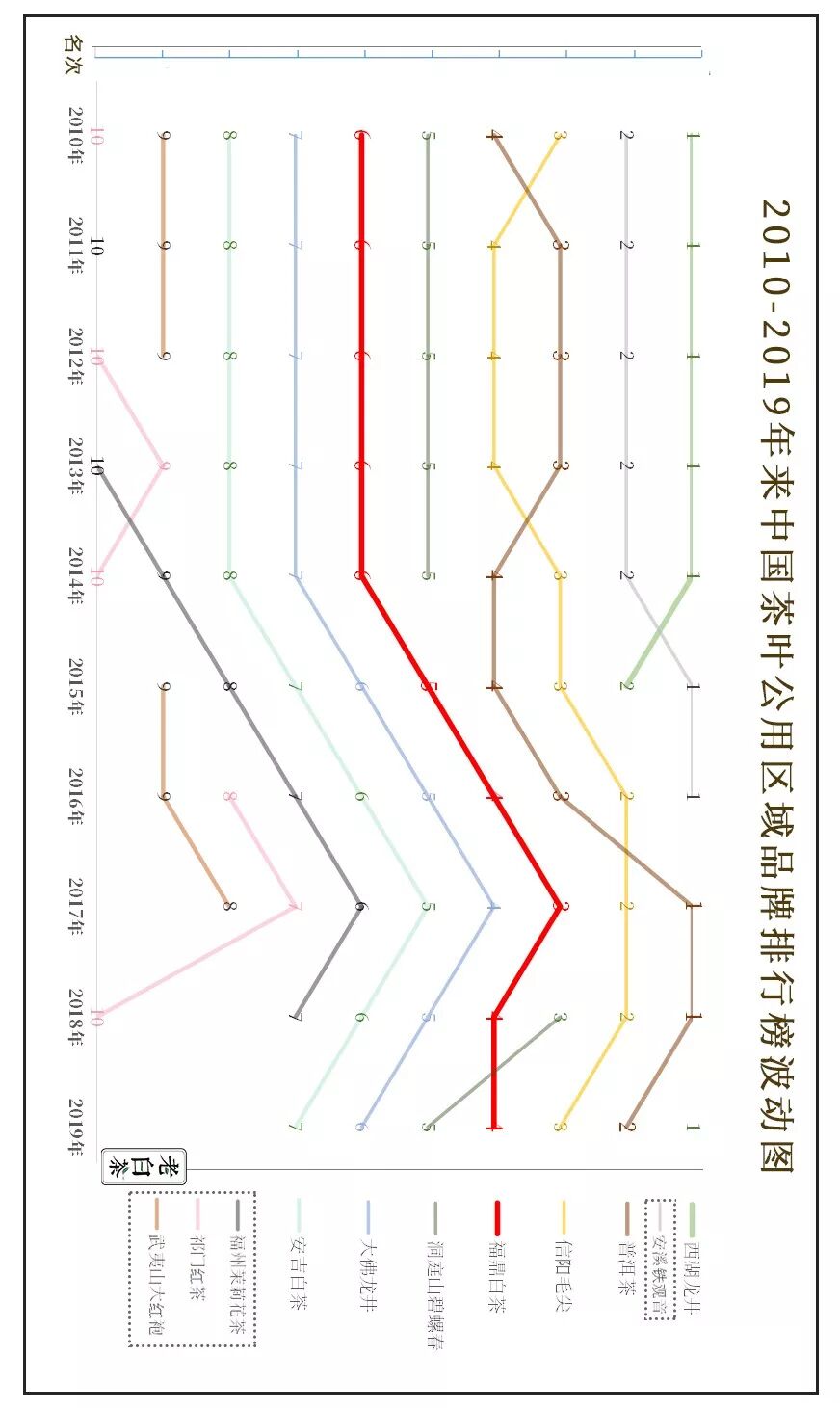 ▲安吉白茶品牌十年来保持稳定,徘徊在榜上第5~第8名,幅度较大。