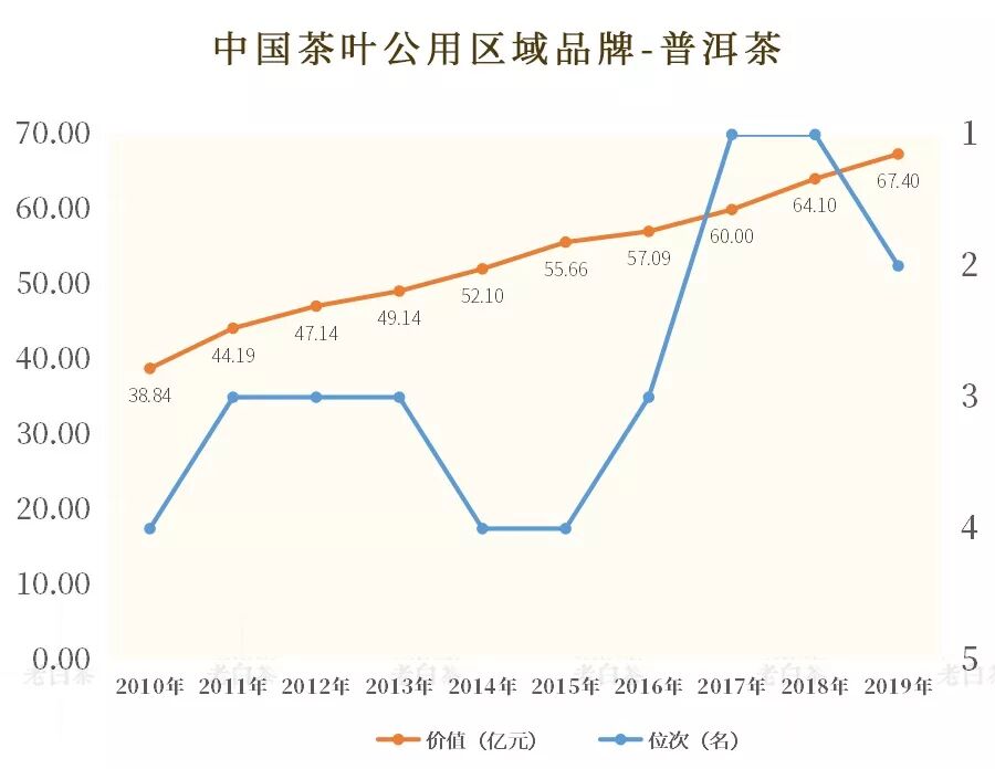 ▲10年来普洱茶品牌价值排名有起有伏,但持续保持在前4名;2017年、2018年连续两年排名第一。