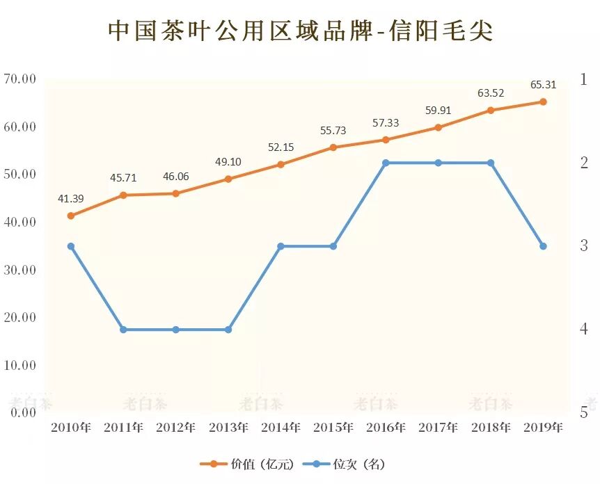 ▲信阳毛尖茶品牌10年前排名第三,10年后的今天仍排名第三;中间10年围绕着第三名上下波动,总体保持其位列前茅。