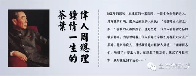 1975年的深秋,我们的总理周恩来徘徊在生死的病痛边缘。一天,沉疴在身的总理突然问医护人员:“有没有六安瓜片茶?……我想喝点六安瓜片茶!”当周总理喝着工作人员找遍京城大小商场才觅得的六安瓜片沏的热茶时,他回味良久,神情凝重地对医护人员说:“谢谢同志们,我想喝六安瓜片,是因为想起了战友们,想起了叶挺将军,喝到了六安瓜片茶,就好像见到了他们……”。