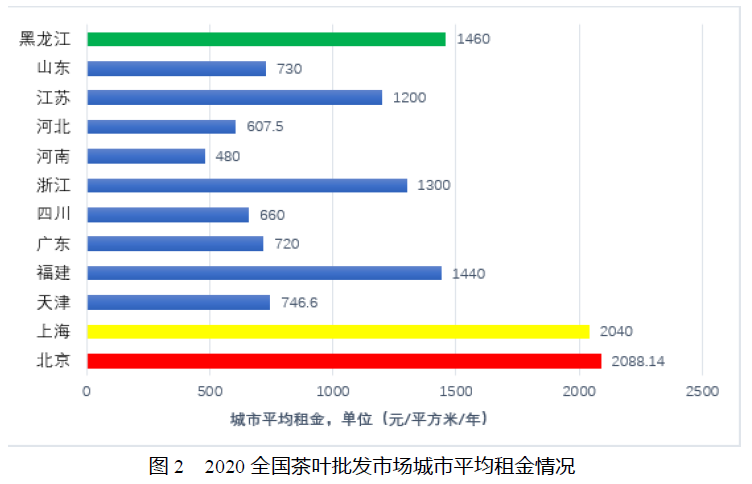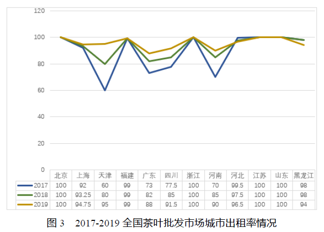 调查结果显示,2020年样本茶叶批发市场总商户数量为7859家,知名品牌企业达724家,占总商户数量的9.2%。平均租金为1274.88元/平方米/年,排名前三名的城市依次为北京,上海,黑龙江(图2)。近三年,全国茶叶批发市场的平均出租率稳中有增,2017年为90.36%,2019年达到95.18%。北京、上海、山东、福建、浙江、河北、江苏、山东、黑龙江始终保持着90%以上的出租率,天津、广东、河南、四川也有明显提升(图3)。