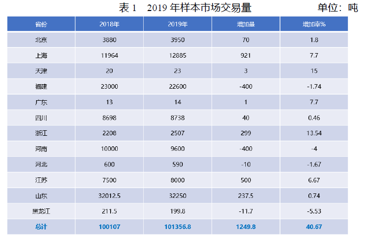 2018年,2019年中国茶叶国内销售总量分别为191万吨、203万吨。调查结果显示,2018年,2019年样本茶叶批发市场交易总量分别为10.01万吨,10.14万吨,分别占当年销售总量的5.24%,5%。(表1)