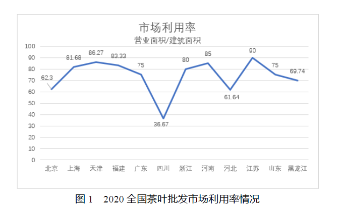 根据2020年样本市场数据统计,样本市场中茶叶专业批发市场为12个,占比为66.7%,综合型批发市场为6个,占比为33.3%,综合型批发市场中的茶叶比值平均为71.83%。建筑总面积为106.62万平方米,营业总面积为76.89万平方米,批发市场平均利用率为72.12%(图1)。