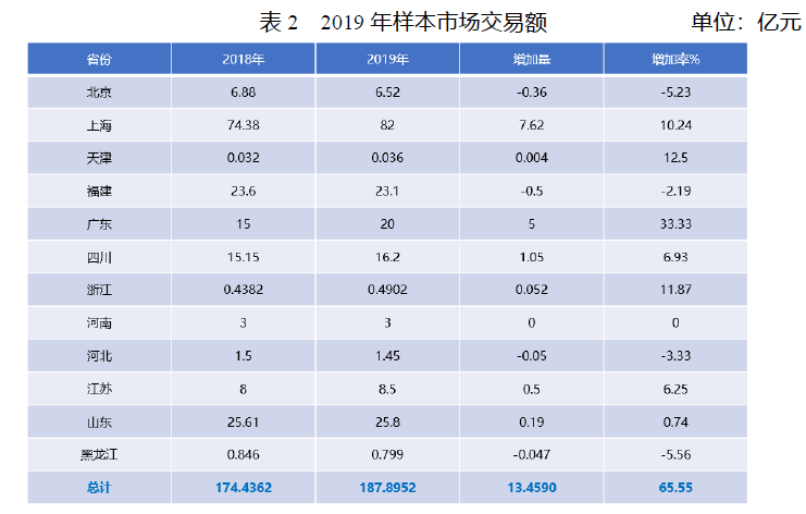 2018年,2019年中国茶叶内销总额分别达到2661亿元、2396亿元。调查结果显示,2018年,2019年样本茶叶批发市场交易总额为174.44亿元,187.90亿元,分别占当年内销总额的6.56%、7.84%。(表2)