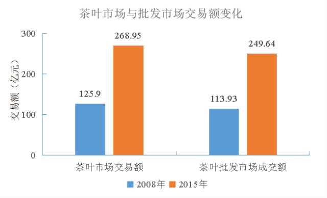 产地茶叶批发市场是茶叶从产区到销区的主要场所和流通主渠道,是茶农直接参与和感受市场变化的主要场所,对于引导茶农生产,实现技术扩散和合理调整生产结构具有重要意义。国家统计局数据显示,2008年以来我国亿元以上茶叶市场交易额不断增加,由2008年的125.9亿元增加到了2015年的268.95亿元,与此同时,茶叶批发市场成交额也同步增长,由2008年的113.93亿元增加到了2015年的249.64亿元。除2014年茶叶市场交易额与茶叶批发市场交易额分别同比增加1.13%和0.23%,其余年份的年增长率均在8%-23%之间。