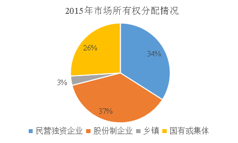从市场的投资资金来源看,主要依靠银行贷款建设的茶叶批发市场占比最高,为26%;其次是采用组合投资的方式,通过政府拨款、银行贷款、对外招商和合伙集资等资金来源相结合的方式获取投资资金,另有14%的茶叶批发市场主要依靠对外招商进行投资。从市场的所有权属性来看,2015年在监测的茶叶批发市场中,民营独资企业和股份制企业经营比例最高,分别为34%和37%,乡镇所有的市场占3%,其余市场属于国有或集体所有。