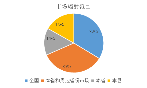 为了适应茶叶消费结构的变化,产地批发市场的经营产品结构也趋于多样化。“十二五”期间,除了绿茶、红茶、乌龙茶等市场传统主流消费产品,黑茶、白茶、黄茶等茶类也相继成为消费热点,相应地,我国茶叶产地批发市场经营的茶叶品类逐步趋于多样化,但是市场交易仍以绿茶和红茶交易为主,其次是乌龙茶、普洱茶和黑茶,再次是花茶。调研数据显示,32%的茶叶产地批发市场辐射到全国各个省市;33%的茶叶产地批发市场的客商来自本省和周边省份市场;主要服务本省和本县的市场分别占比14%和16%。
