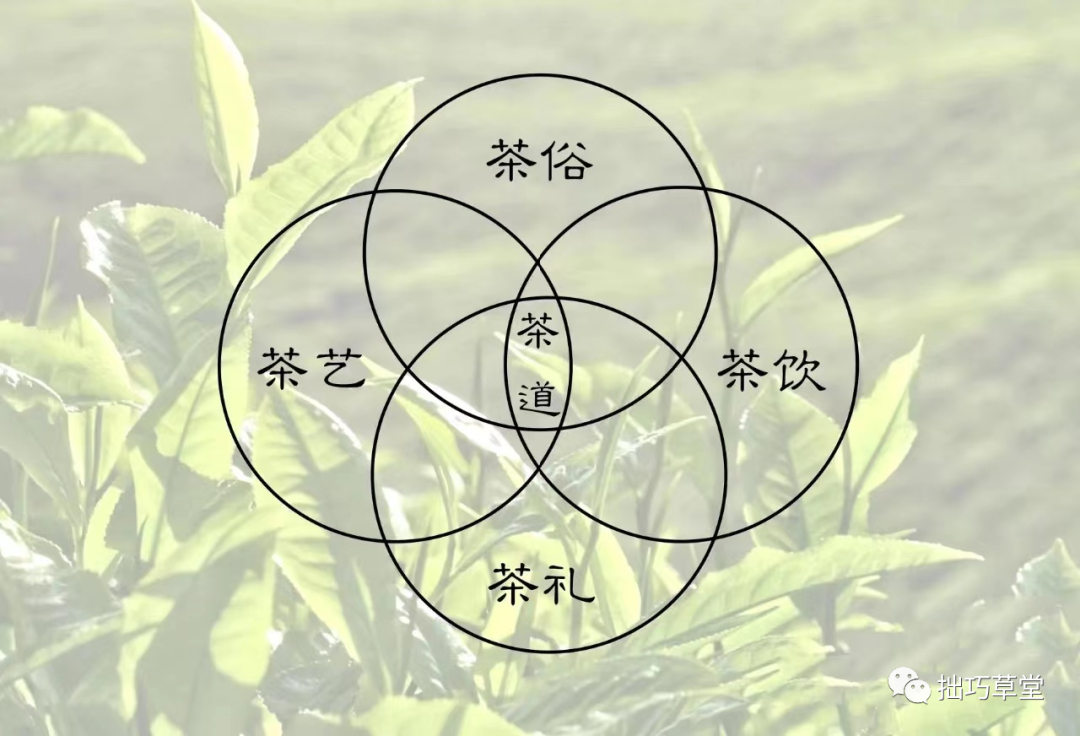 茶文化作为一种生活文化,它由“茶饮、茶俗、茶礼、茶艺、茶道”五个层面架构而成,可分为三个文化类型:“茶饮是物质文化层,茶俗、茶礼、茶艺是物质与精神的结合层,茶道则是精神层面”。