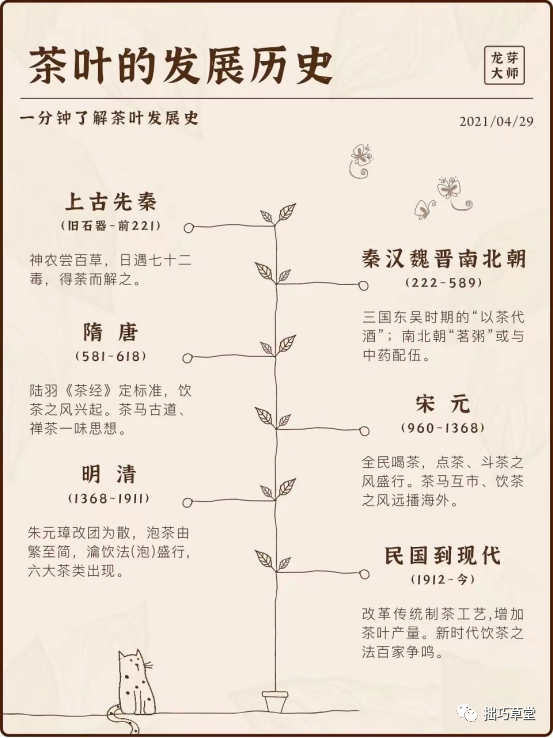 1、神农时代:5000年以前,神农时代利用生叶煮着喝,把茶叶拿来当药用。2、西周、东周:3000以前,开始人工栽培茶树,当菜食。3、秦代:2300年以前,开始当茗饮,调煮,羹饮。4、汉代:(西汉)2000年以前,开始商业化,成都成为我国茶叶最早的集散中心。(东汉)1500年左右,开始制作茶饼,以便运输。5、唐代:1200年以前,受唐代经济、文化的影响;陆羽《茶经》的倡导;僧道生活和茶为教事吸收的影响,气候条件也有得于茶业的发展。6、宋代:1000年以前泡茶技艺得以改进,更注重水质和器具,出现点茶、斗茶。7、元代:700年以前,制作散茶,重炒略蒸。8、明代:距今600多年,黄茶、黑茶和花茶的工艺相继形成。9、清代:300年以前,中国茶风靡世界,独步世界茶市,当时出口茶叶的只有中国,工艺以烘青和炒青为主,制作了乌龙茶、红茶、黑茶、花茶、绿茶、白茶。10、近代:(1)1846-1886年是中国茶叶的兴盛时期(茶园面积不断的扩大,茶叶产量迅速增递,有力的促进了对外贸易发展)。(2)1886-1947年,是中国茶叶生产的衰落时期(政治、经济方面、国际茶叶市场竞争失败)。(3)1950-1988年,是中国茶叶生产的恢复发展时期,政府的支持和重视,大力恢复旧茶园,建立新茶园,改进新品种,推行科学种茶,茶叶经济走向稳定发展之路。使得茶叶生产量居世界第二位。(图源网络,如有侵权联系删除)