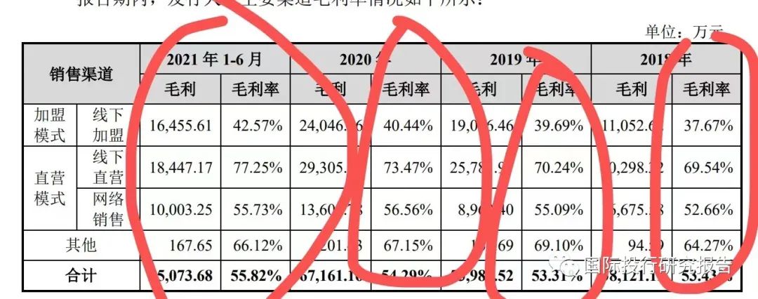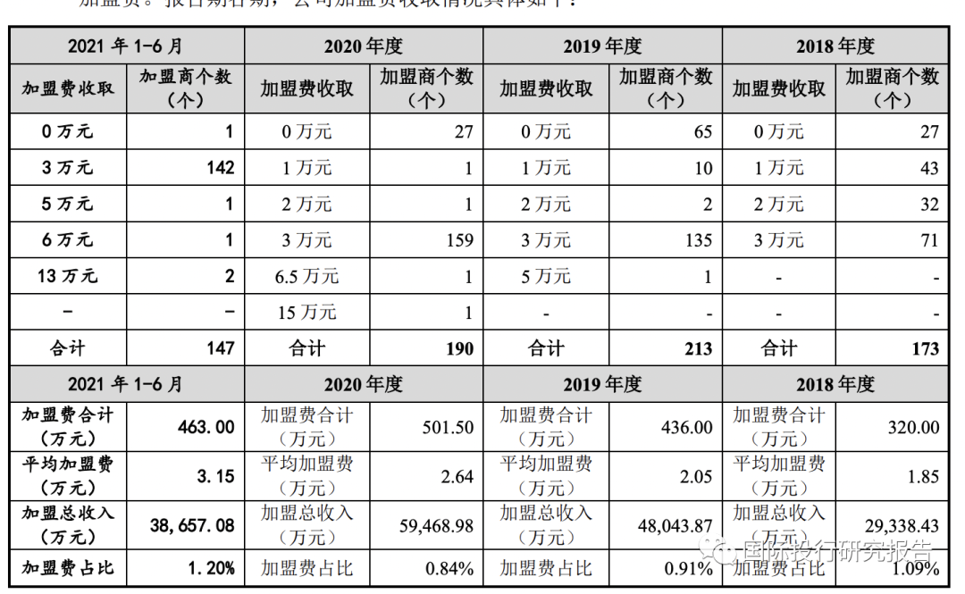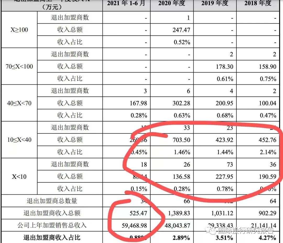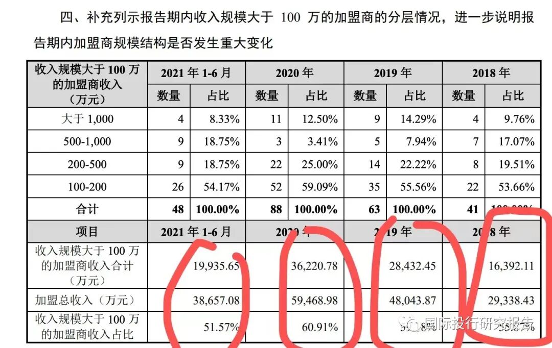 IPO说明书显示,虽然公司有1994家加盟店,但100万以上营业额的加盟店很少。2021年上半年只有48家达到100万,占加盟店的2.4%,就算按照年度计算,也只有4.8%。