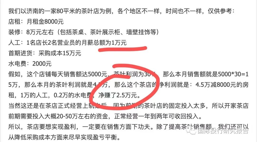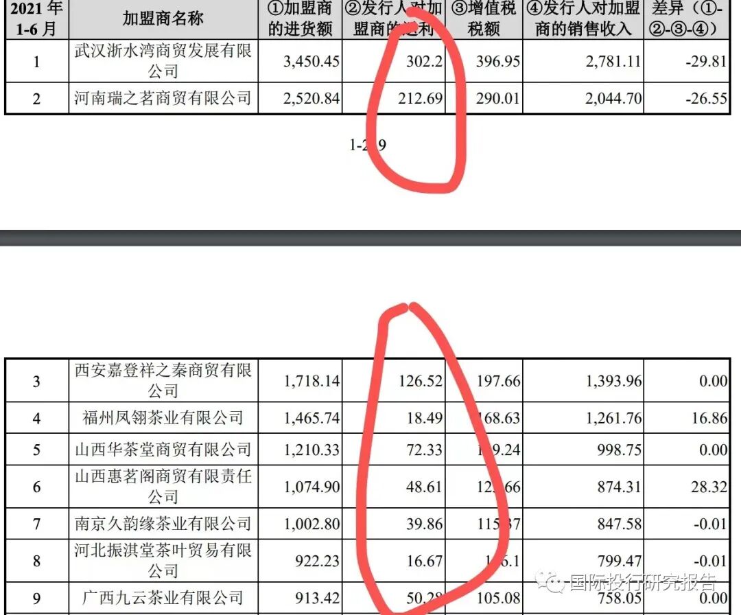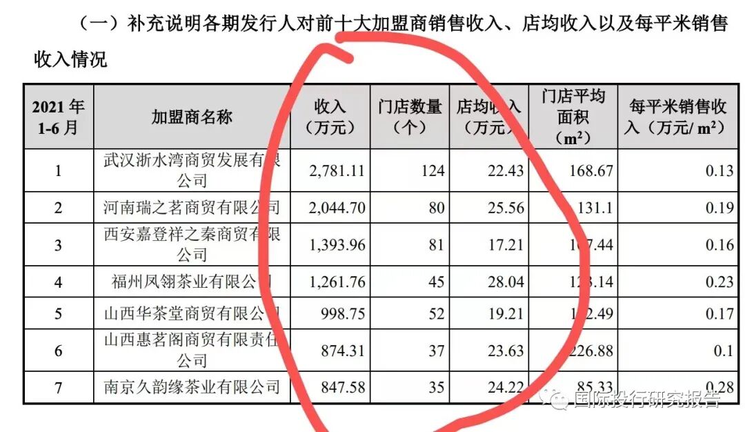 01武汉浙水湾:每店每个月卖掉3.738万茶叶2021年上半年,第一大加盟商武汉浙水湾拥有门店124个,工商资料显示,公司只有61个人交了社保,店均收入22.43万,也就是说每个月卖掉3.738万。按照30%的利润计算只有1.12万元毛利。