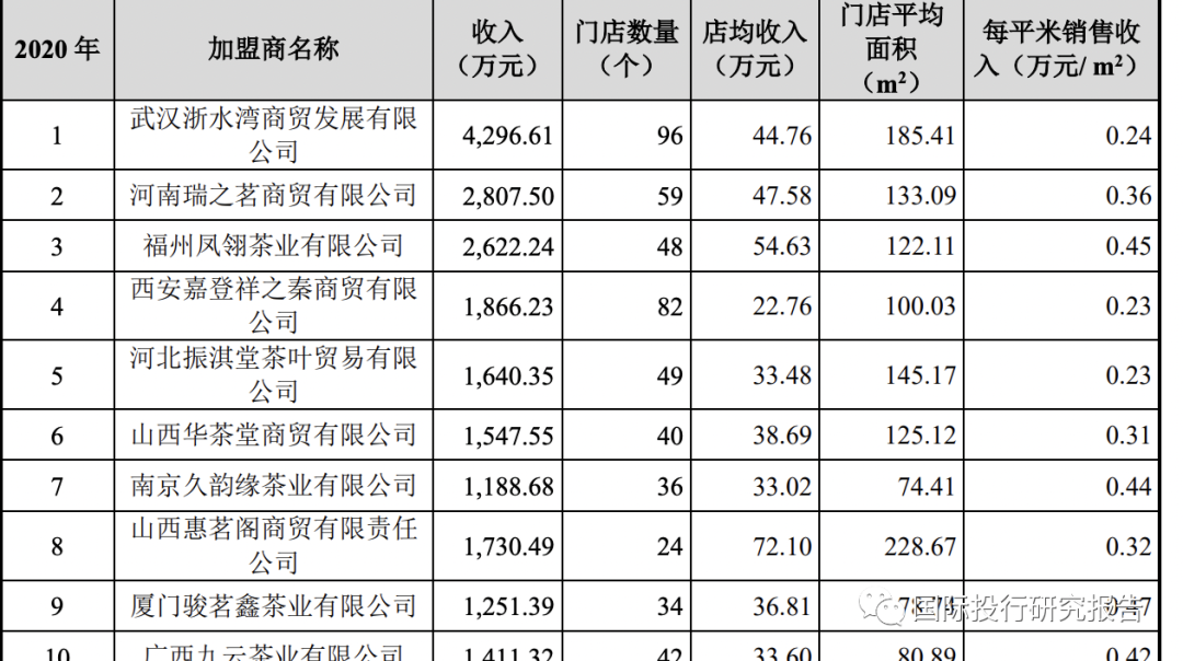 2020年,公司一共有1739家加盟店,卖掉100万以上的有88家,占5.06%,但卖掉的茶叶占总加盟模式的60.91%,也就是说1651家加盟店卖掉了39.09%合2.3248亿的茶叶,平均每个加盟店卖出了14万的茶叶。