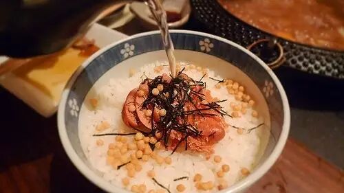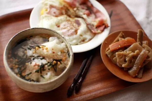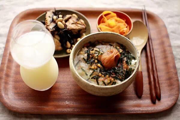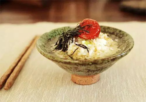 茶泡饭是用热茶水来泡冷饭。梅干茶泡饭佐以盐、梅干、海笞等配料,茶一般是用绿茶,并切成条状,和饭一起泡。茶泡饭不仅口味清新,还有不小的食疗功效: