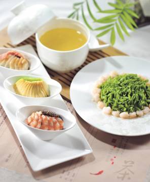 杭州的一道美味名菜“龙井虾仁”,就是用开水泡开的龙井茶叶和虾仁配炒而成。此菜红绿相间,味美可口,可连同茶叶一起吃下去。
