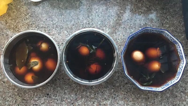 3颗普通鸡蛋、桂皮1块、香叶2片、八角2颗、花椒若干、生姜片3片、冰糖2颗、葱2束、茶叶,生抽,老抽为方便对比,每种茶都只用5克,第一批分别选用乌龙茶的正味铁观音,红茶鼻祖正山小种,熟普。茶叶等级普通,说要母树大红袍,西湖龙井的都是真正的土豪。曾经有个家里的“牛肉”被媳妇用来煮茶叶蛋的网友,为你心疼一秒钟