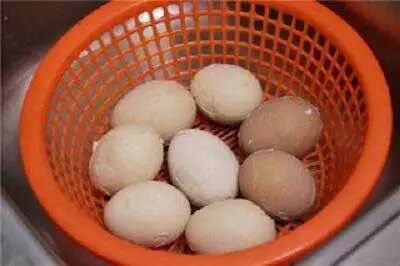 2.煮好后将水倒掉,用冷水冲一下鸡蛋,待冲洗鸡蛋至不烫手温度时用勺子轻轻敲碎鸡蛋外壳,一点要轻轻的哦,免得整个碎掉