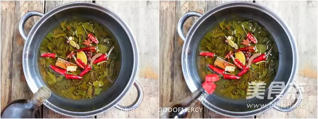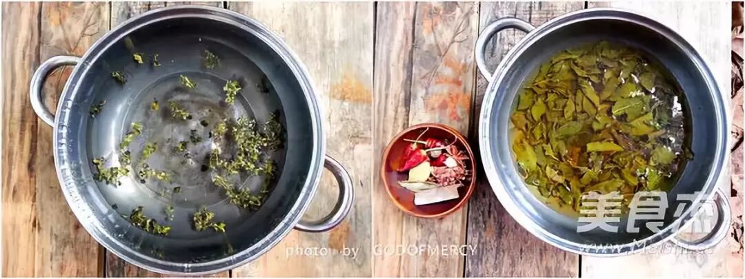 3.锅中注水烧开,放入铁观音泡发。家里红茶没有了;在铁观音和绿茶之间权衡了一下,最后决定用铁观音。铁观音泡发到颜色和香气扑鼻时,放进洗净的卤料。