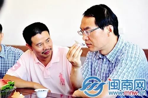 安溪县县长高向荣(右)与非遗传承人魏月德探讨茶叶制作技艺