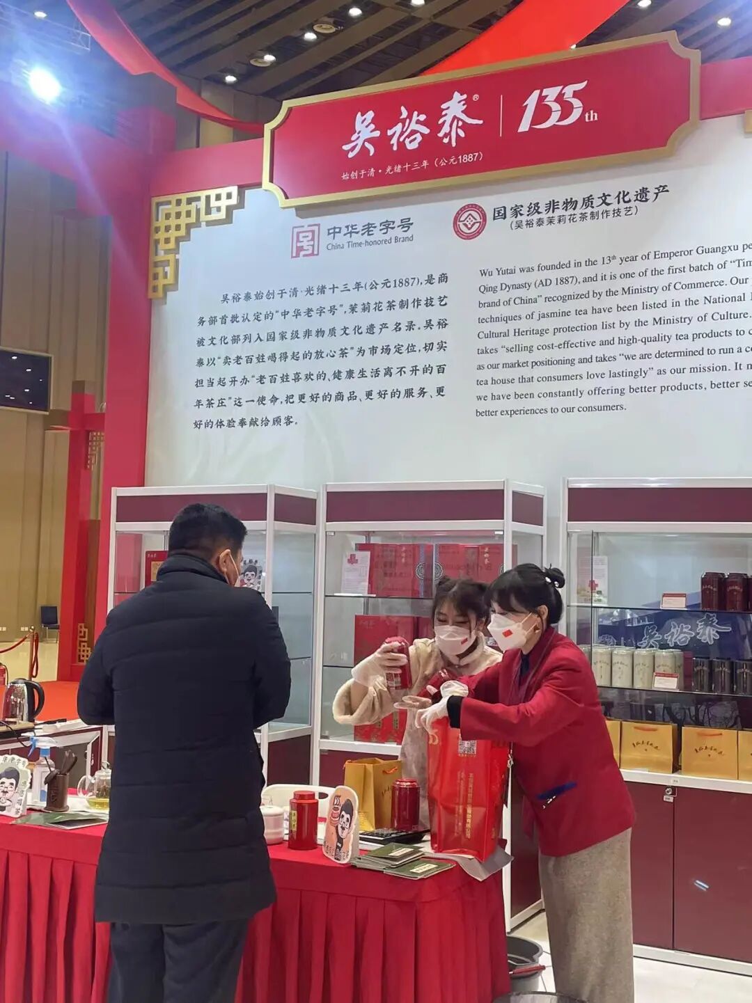 吴裕泰携贡毫、御泰壹香、茗天贡毫,花语茶言、有机茶等14款代表产品亮相展销会,现场花茶茶艺表演让外宾近距离体验中华优秀传统文化底蕴,感受茶文化魅力。本次展销会共接待卢森堡、泰国、蒙古、厄瓜多尔、韩国等10个国家的12个代表团,服务外国元首新加坡总统哈莉玛·雅各布、卢森堡大公亨利、泰国公主玛哈·扎克里·诗琳通、波黑议会主席。凭借更好的茶叶,成为冬奥国际展销会众多企业中单品销售量冠军。