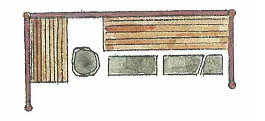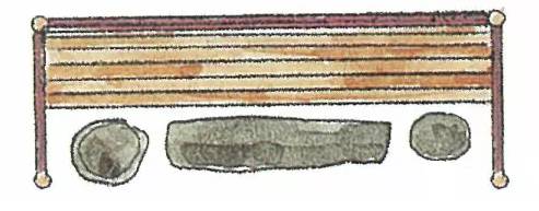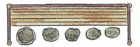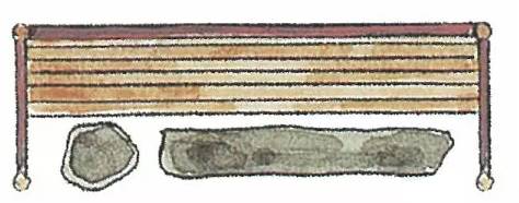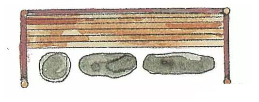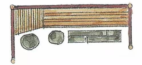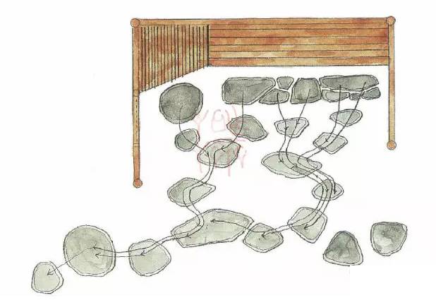 日本茶庭露地中都铺有各种各样的石头,这些石头在茶道中被总称为“飞石"。飞石的种类、铺法和用途颇有讲究,且门类复杂。但飞石的主要用途是起到引导指示的作用。在腰掛这里的石头被细分称为“役石”。正如前面所说,役石在这里是为了让宾客区分身份用的。即根据脚下的役石来判断座位的次序。下图是几种腰掛待合处的役石摆放方法。