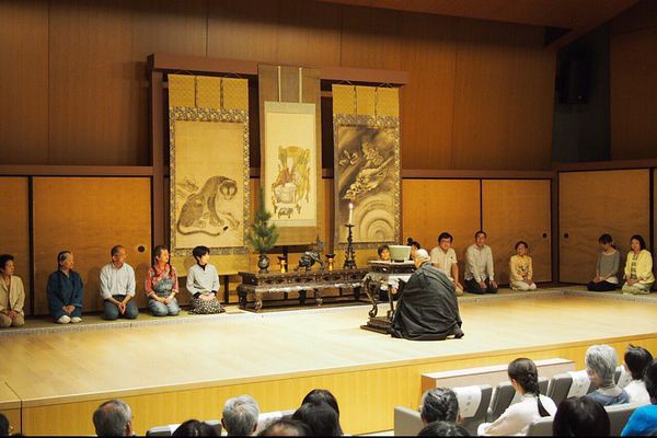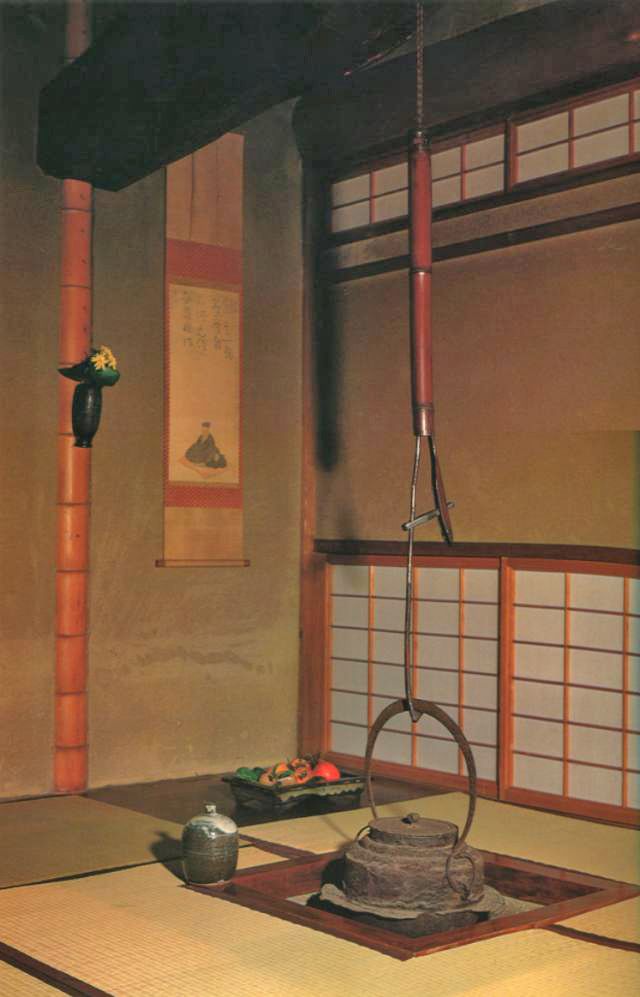 图210 建仁寺方丈院四头茶会挂画“四头茶会”是室町时代延历寺的学僧玄慧法印,依照“吃茶往来” 所记载的喝茶礼仪而制定的日本最古老的茶法。之所以称为“四头”,乃是中国禅寺待客规矩以四名正客(称为“头”)为基本格式的缘故, 四头是指寺院里的四位主要执事僧人:首座、住山、位长、参暇(宗务长)。每位客人各带八位侍者(相伴客)一同入席。客人坐定后,会有四位僧人端上盛有抹茶粉的天目茶碗与点心盒,另有四位僧人带着茶筅与净瓶进入茶室,依序在天目茶碗内注入热开水并予以搅拌。“四头茶会”被认为是日本茶道的源头之一,京都的建仁寺和福冈的圣福寺在每年四月举办“四头茶会”,而镰仓的建长寺在每年十月祖师忌日举行“四头茶会”。