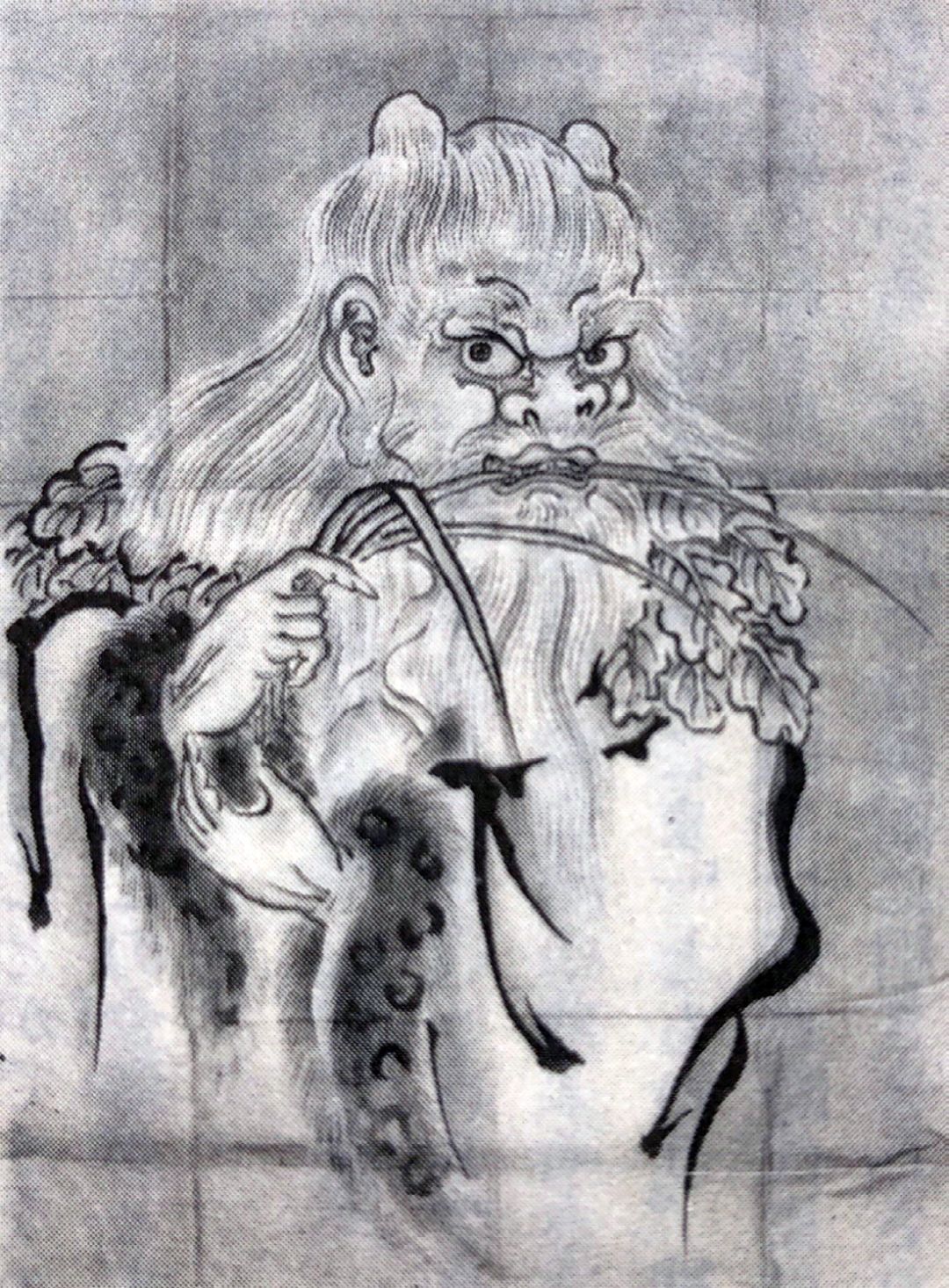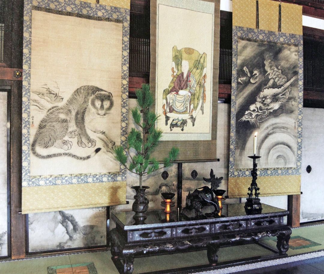 图209 神农图 尾形家绘画资料 福冈县立美术馆藏每年四月二十日是荣西禅师诞辰纪念日,建仁寺都要在方丈院举办四头茶会,茶会上的茶挂是三联画挂轴,中间为荣西禅师画像(图 210),右侧是龙图,左则是虎图,龙虎如同护法一样紧随荣西禅师, 即使是将“四头茶会”移师至京都国立博物馆举办时,三件挂画一样同时 出现,这样的配置已经成为建仁寺“四头茶会”的标志(图 211)。