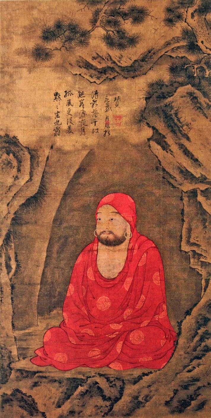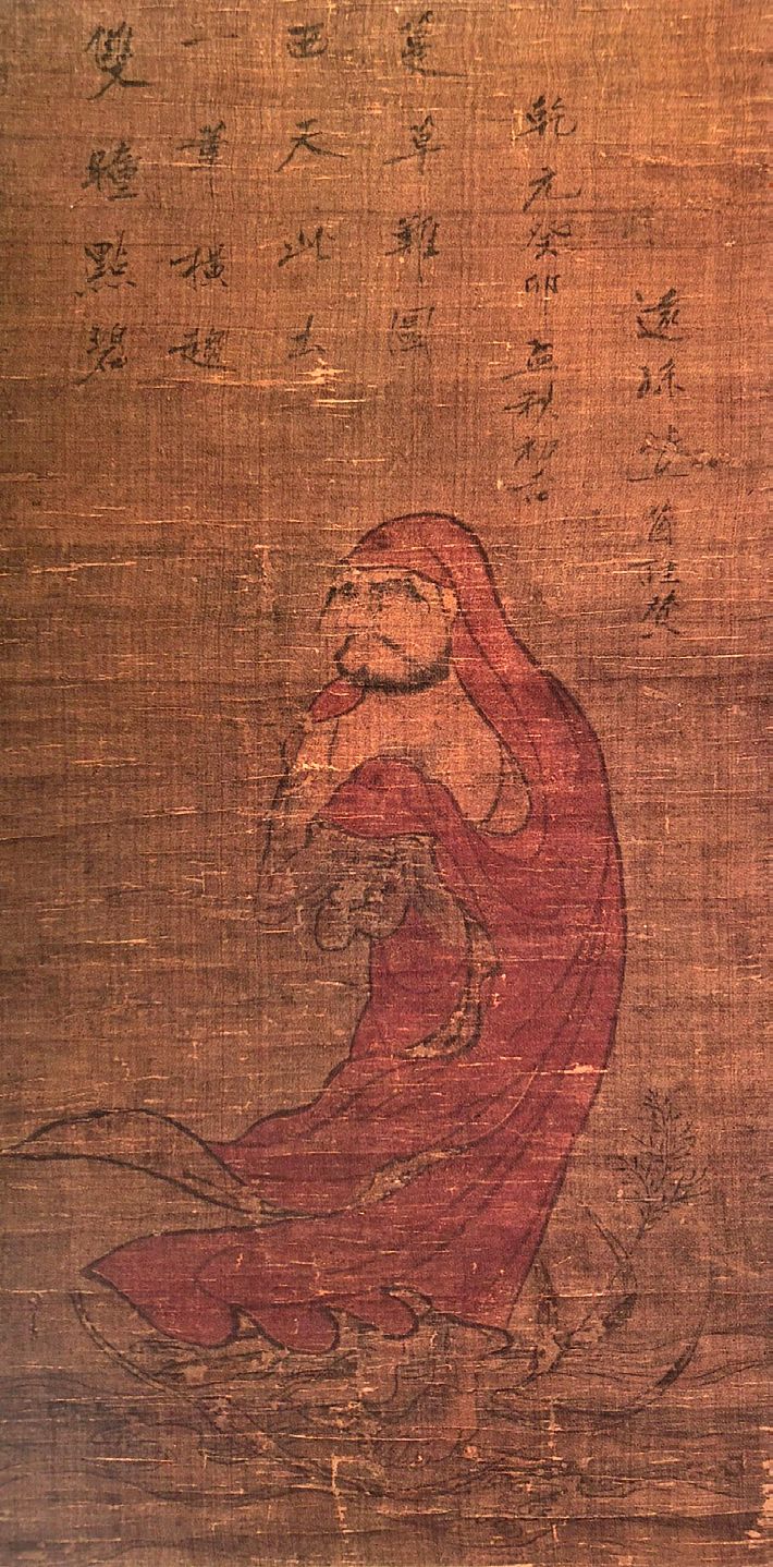图206 洞窟达摩图 无象静照赞 京都鹿苑寺藏因此,不论是中国的禅宗五派,还是日本的禅宗三家, 以及朝鲜半岛上的曹溪宗一脉,虽有教义上的些许区别, 但达摩和慧能依然被各宗各派奉为共同的祖师,在各大佛教寺院中都有悬挂禅宗祖师像(顶相)的传统,在举办茶会时更是要请出祖师,以保平安和祈福众生(图 206)。