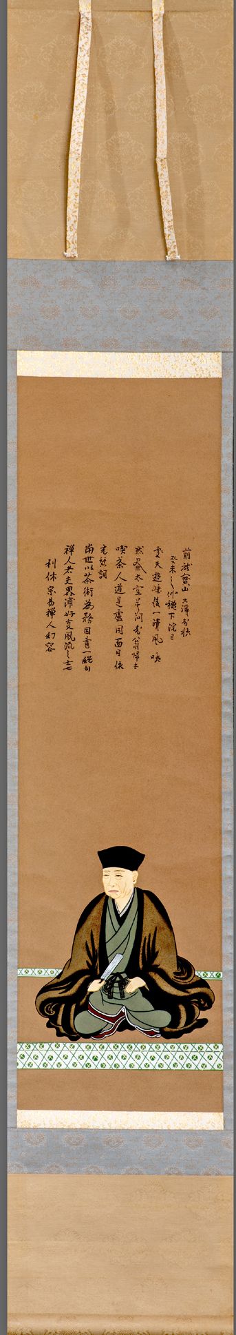 图212 利休坐像 纯道藏常见的利休画像共有三种,除了上面的坐像外,还有立像和椅像,它们可以在不同场合的茶事活动中悬挂,成为茶会上最常见的人物像茶挂(图 213)。