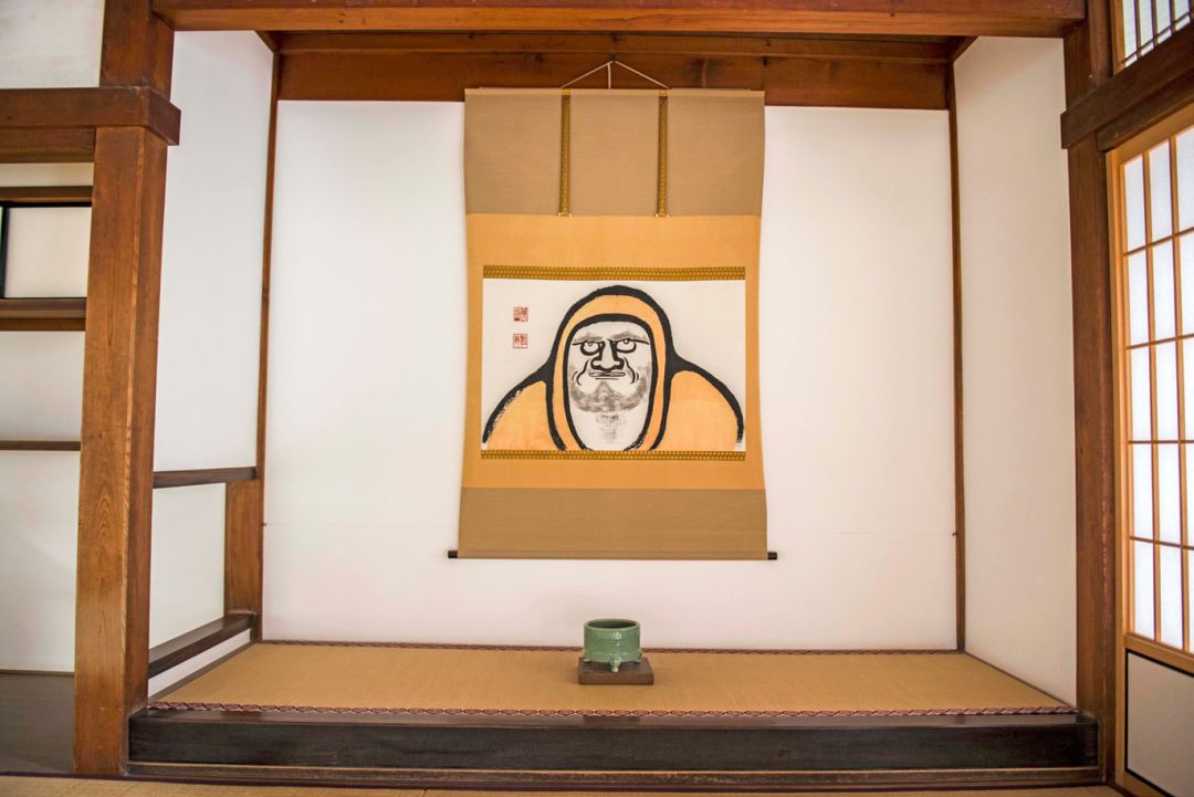 冈仓天心在他的《茶之书》中指出 :“禅门有僧侣在达摩祖师画像前依次共饮一碗茶的仪式,这是日本茶会的渊源......日式房间里的壁龛是表示敬意的地方,用来放置绘画和插花,以陶冶宾客的性情。”图203 达摩像 京都天龙寺藏日本人认为 :达摩象征着百折不挠和开运,因此在一些重大的考试前,一些茶室里会出现达摩挂轴(图 203)。森下典子在《日日是好日——茶道带来的十种幸福》中写道:学生们回去后到昏暗的榻榻米房间里,茶釜还冒着热气。突然觉得,老师该不会在等我吧?像平常一样走进房里, 先观赏壁龛里的字画。一幅从未看过的字画。用水墨绘制的达摩,正睁大眼瞪视着我。为什么今天是达摩的字画呢?我寻求答案似的看着老 师。她微笑回答 :“明天你有重要的考试, 所以一度犹豫今天不知该挂什么,后来忽然想起达摩的画像......嗯,先吃点果子吧!”一时间喉头哽咽,不知该回答什么,眼眶也泛泪光, 只好慌乱点头拿走装果子的盘子。达摩象征“百折不挠”及“开运”,或许还有“旗开得胜”的意义。字画表现出当下的季节性,但季节不仅指春、夏、秋、冬,人生也 有所谓的季节。这一天,老师为我挂上 一幅“激励人生”的季节字 画。在黄昏的茶道练习场, 茶釜仍不断冒着热气。