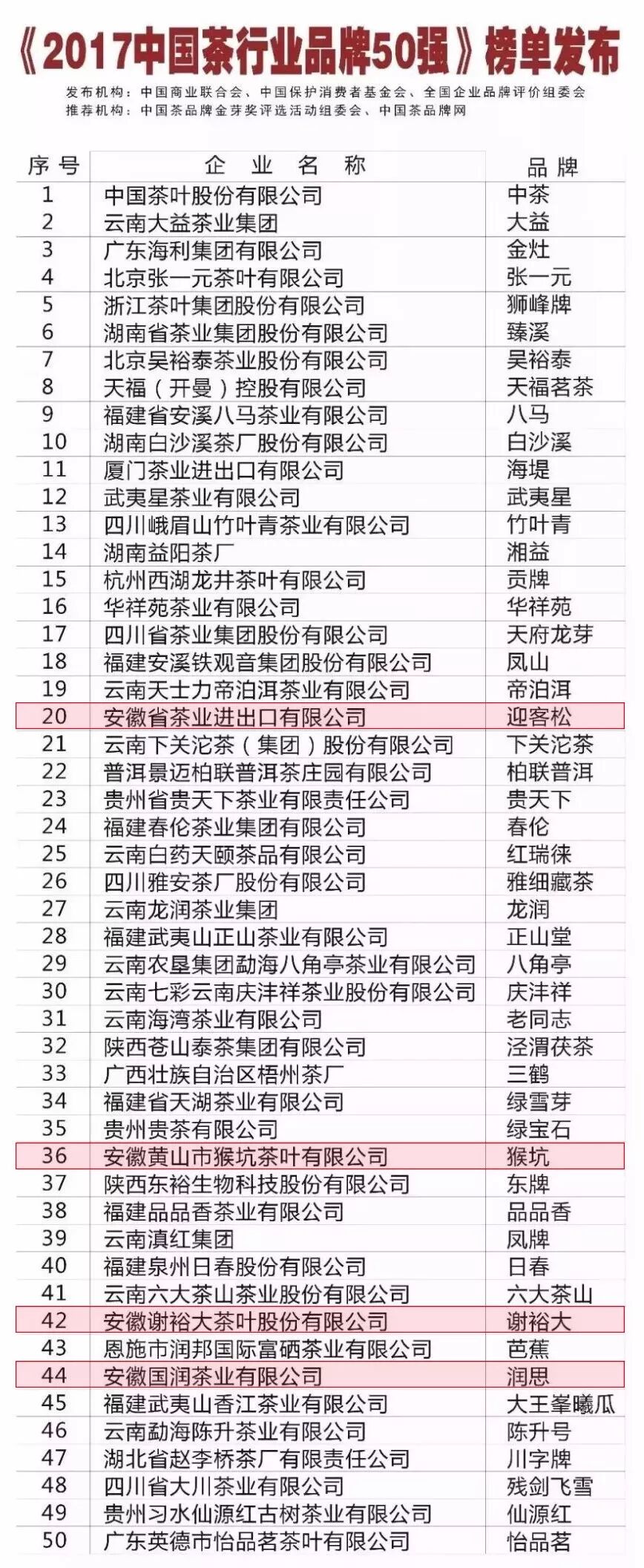 由中国商业联合会、中国保护消费者基金会在北京联合举办的“全国企业品牌评价暨第五届中国企业五星品牌论坛”活动中,安徽省共有四家茶企品牌上榜“2017中国茶行业品牌五十强”。