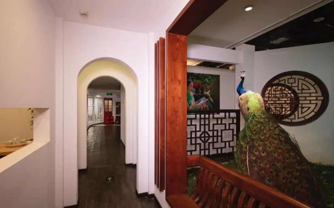 这间茶空间,主题鲜明,以舞蹈家杨丽萍的孔雀艺术为主题。