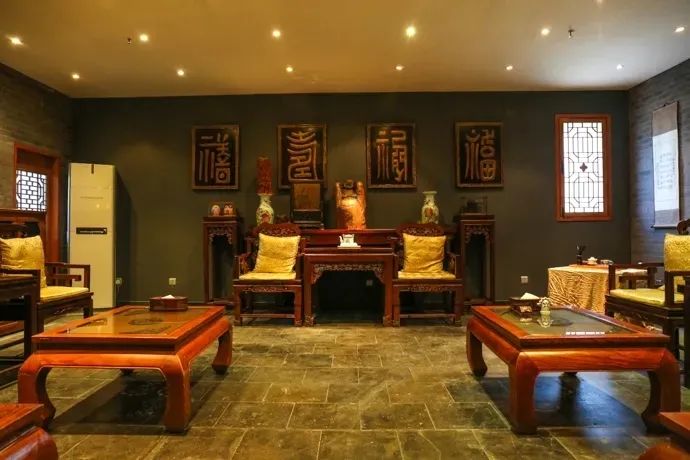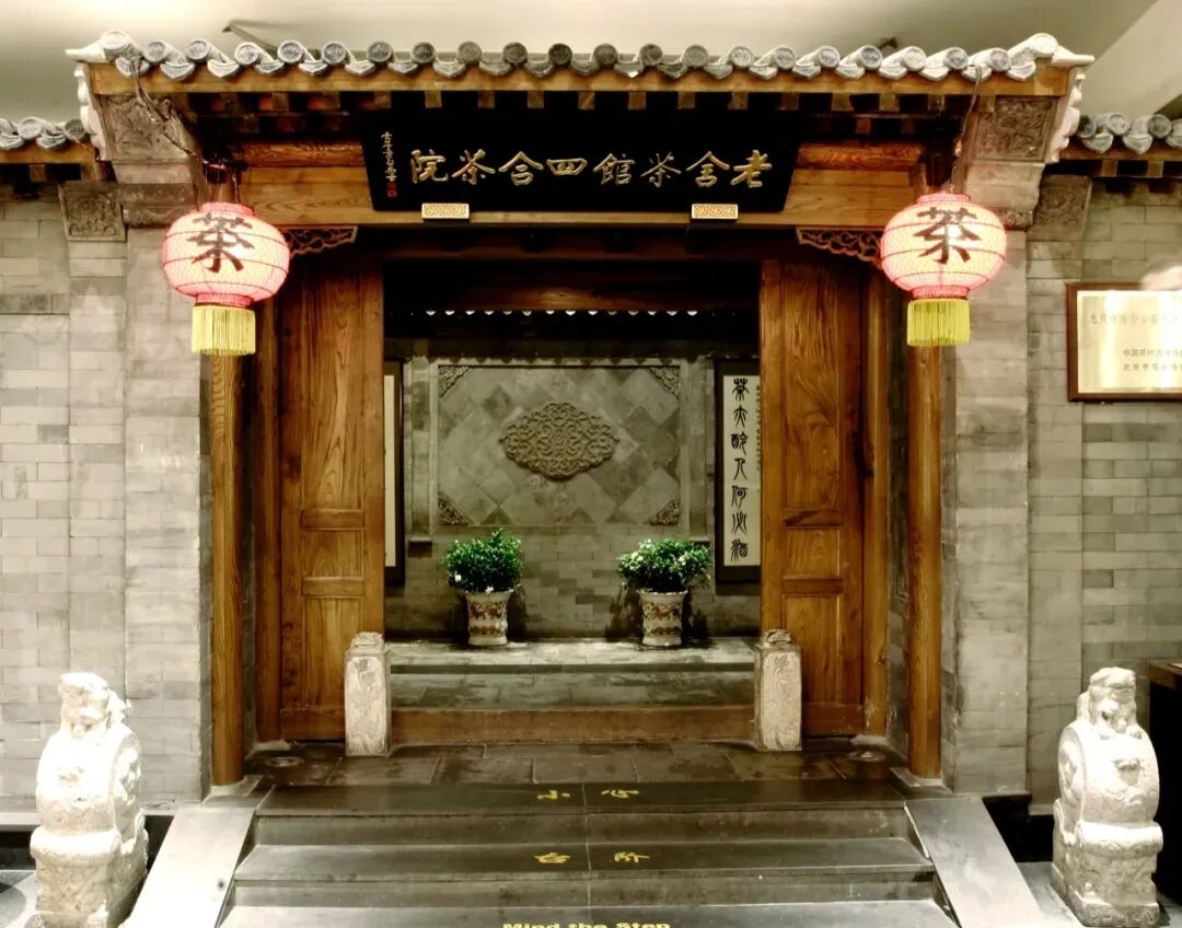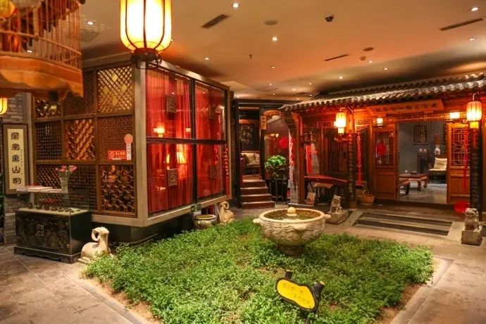 青砖灰瓦的四合院的大门,传统的照壁,门口俏皮的石狮子,青石板地面,绿意盎然的小草坪,加上四周几个茶室飘出的茶香,正是老北京的大气、内敛的四合院之美。