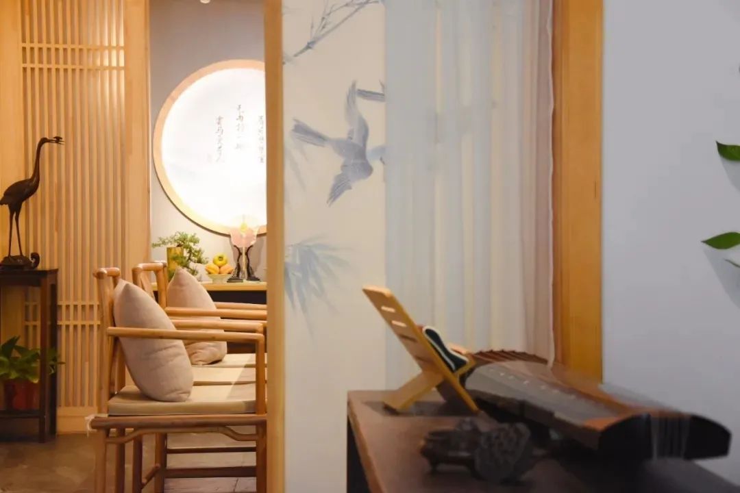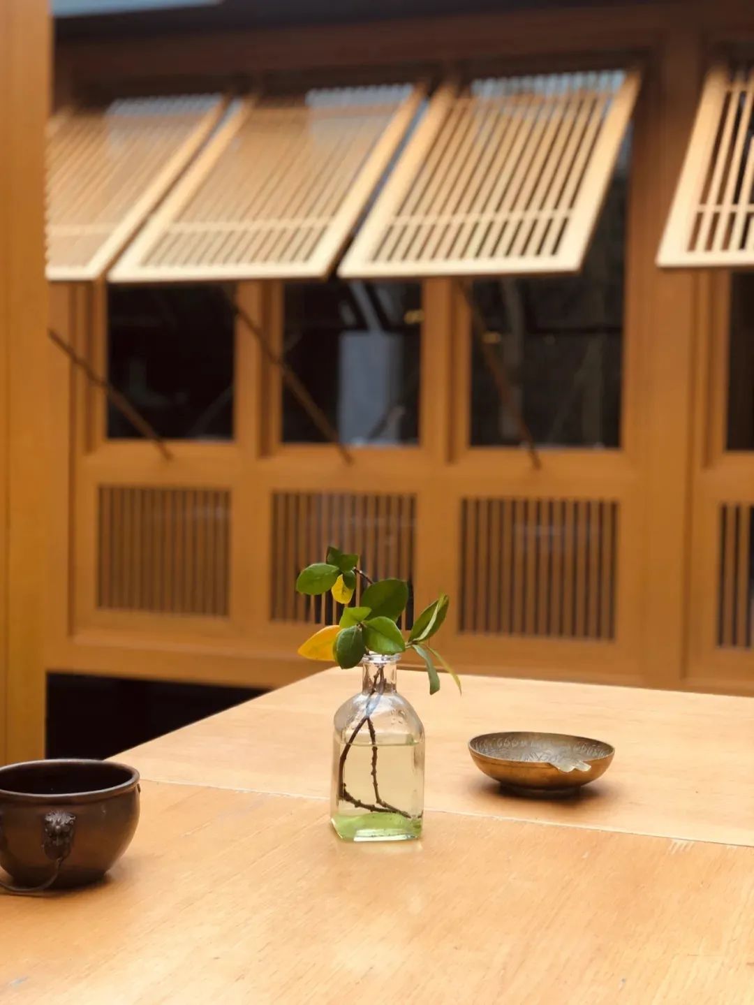一扇古老的窗棂,一盆典雅的兰花,让整个空间产生了灵动之感。后面的两间小茶室内,雅致清新,留白之美呼之欲出。